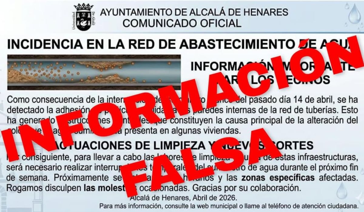 Según ha trasladado el propio Ayuntamiento de Alcalá de Henares, el aviso difundido sobre una supuesta incidencia en la red de abastecimiento es “totalmente falso”. El mensaje, que simulaba tener apariencia institucional, incluía referencias a una presunta alteración en las tuberías y otros elementos que han contribuido a sembrar confusión entre parte de la población.