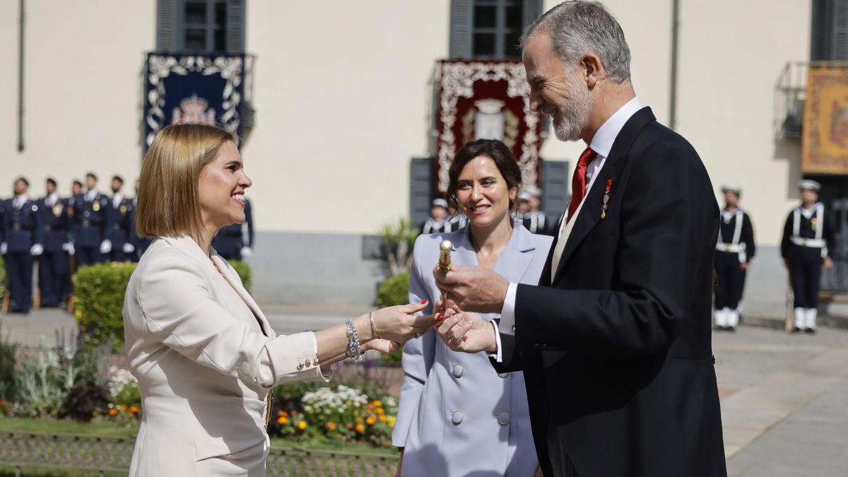 Judith Piquet entregó este 23 de abril el bastón de mando de Alcalá de Henares a Felipe VI antes del inicio de la ceremonia del Premio Cervantes. El acto tuvo lugar en la Plaza de San Diego, en el recibimiento institucional a los Reyes previo a su entrada al Paraninfo de la Universidad de Alcalá.