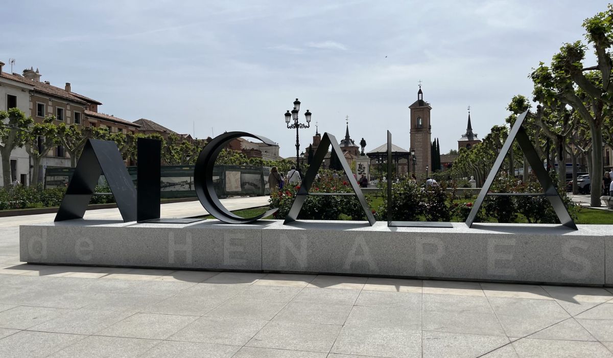 La remodelación incorpora también nuevos elementos visibles en el espacio, como unas letras de acero pulido con el nombre de Alcalá de Henares y la firma de Cervantes en bronce en el pavimento frente a su estatua.